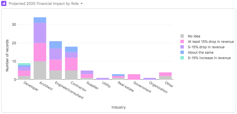 "What have been the impacts of COVID-19 on you or your company's work to date?" Respondents were invited to select true statements from the viewpoint of their role in the building industry. Following are results of how many people selected each statement (it would be interesting to run this survey again to see how responses have sentiments have shifted in the last month):