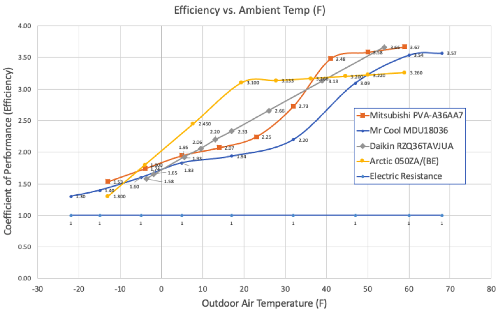 Figure 1 - the efficiency of heat pumps changes with the outdoor temperature. Some data are extrapolated to produce intermediate data points. Electric resistance heat has an efficiency of 1, or 100%. Heat pumps provide more heat energy to the home than the energy they use, so their efficiency is greater than 1.